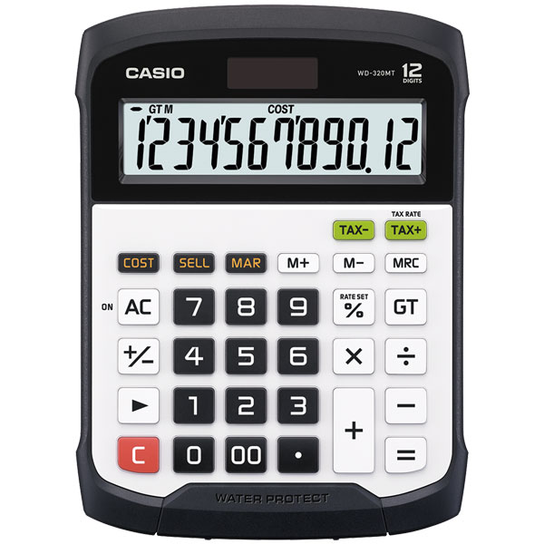 CASIO DESKTOP CALCULATOR WD320MT 12 DIGIT WATER PROTECTED/DUST PROOF WHITE/BLACK