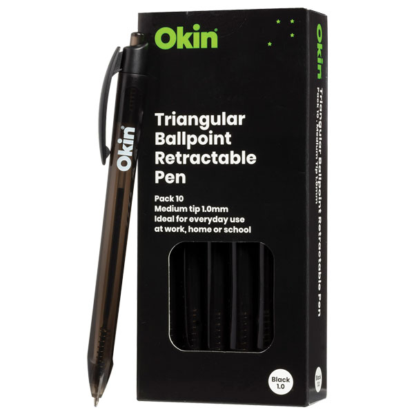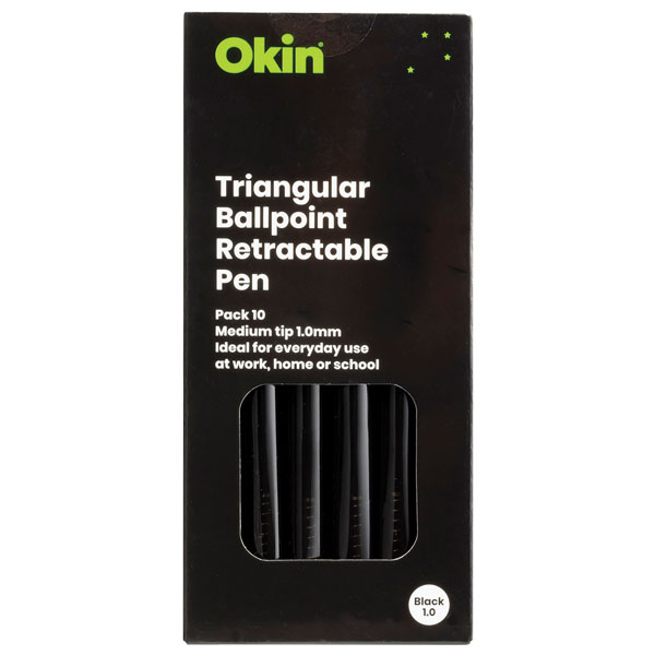 Okin Retractable Ballpoint pens with triangular barrel are ideal for everyday use at work, home or school. They have a high quality ink that is waterproof and fadeproof. The medium tip provides smooth ink flow to avoid scratching and blotting. Black. Medium tip 1.0mm. Purchase 10 to receive a pack.