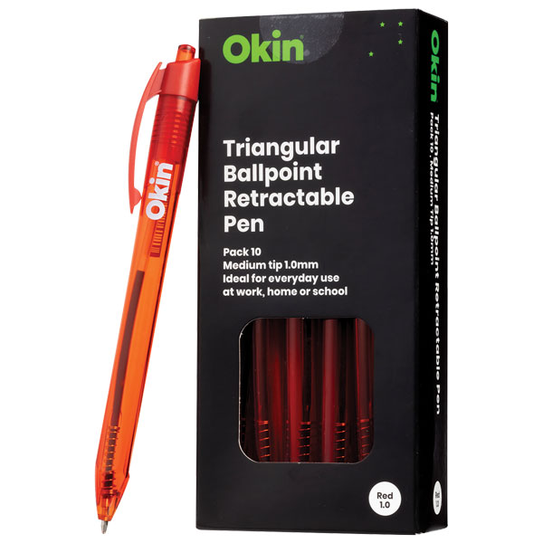 Okin Retractable Ballpoint pens with triangular barrel are ideal for everyday use at work, home or school. They have a high quality ink that is waterproof and fadeproof. The medium tip provides smooth ink flow to avoid scratching and blotting. Red. Medium tip 1.0mm. Purchase 10 to receive a pack.